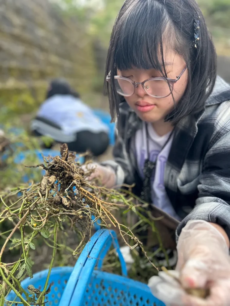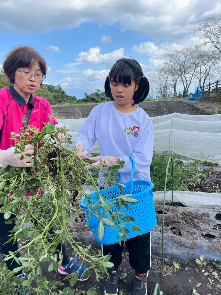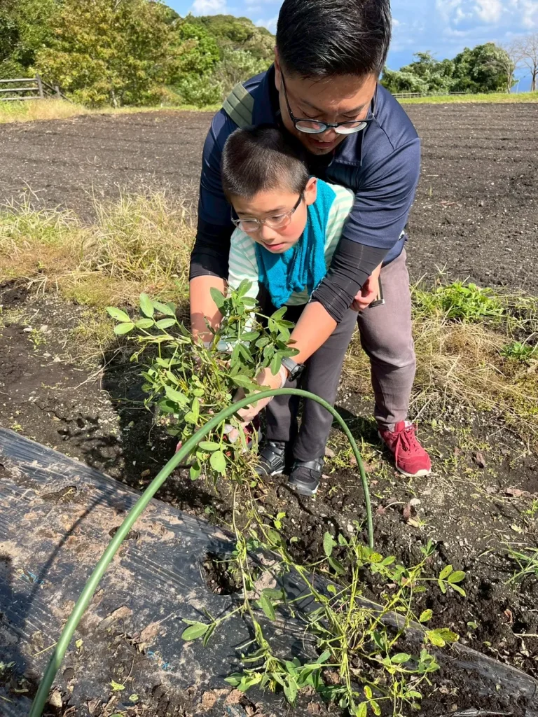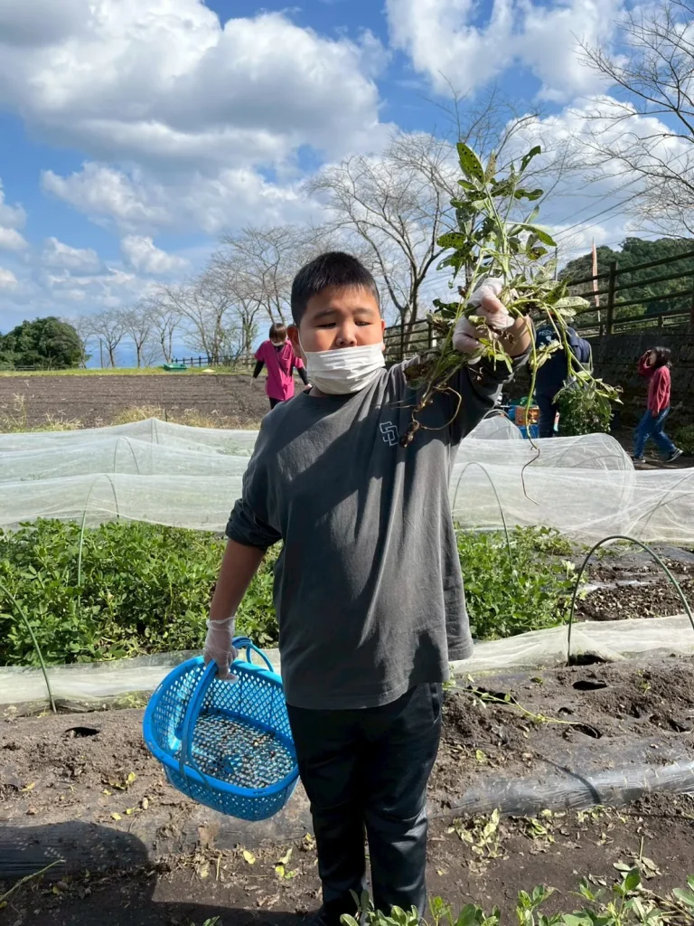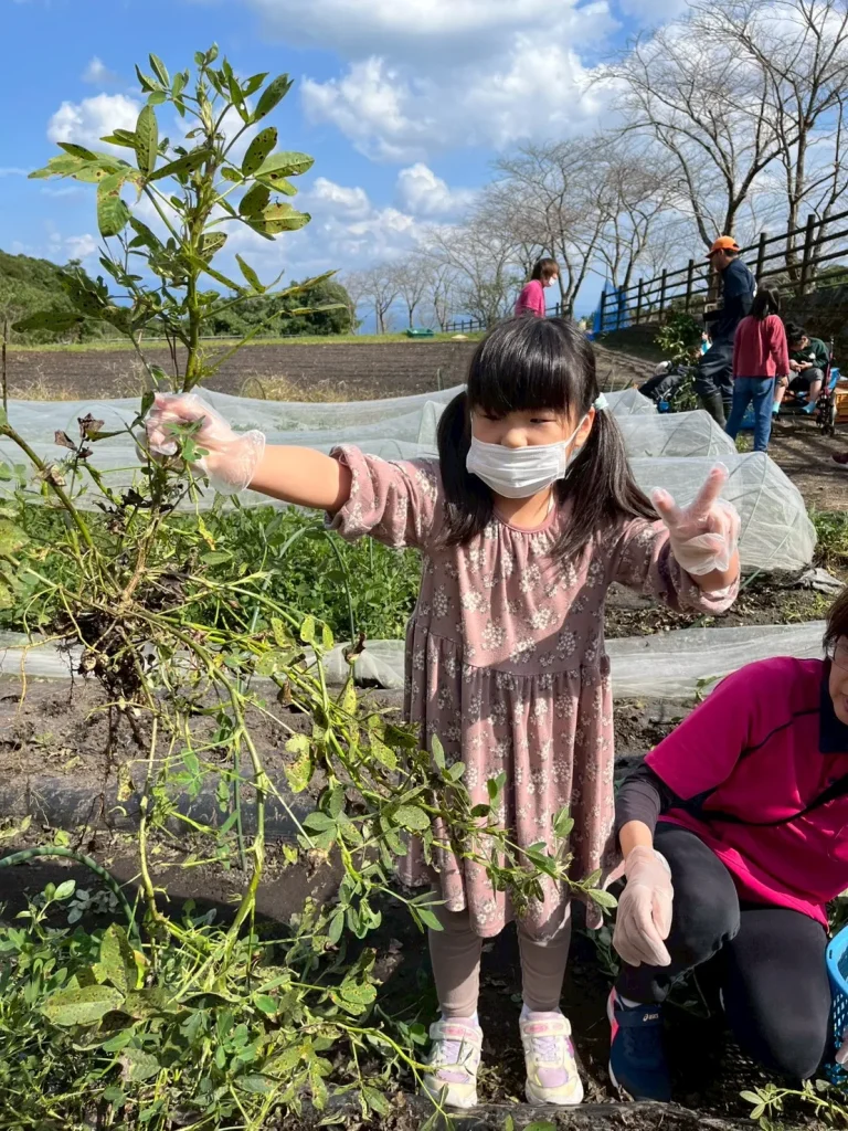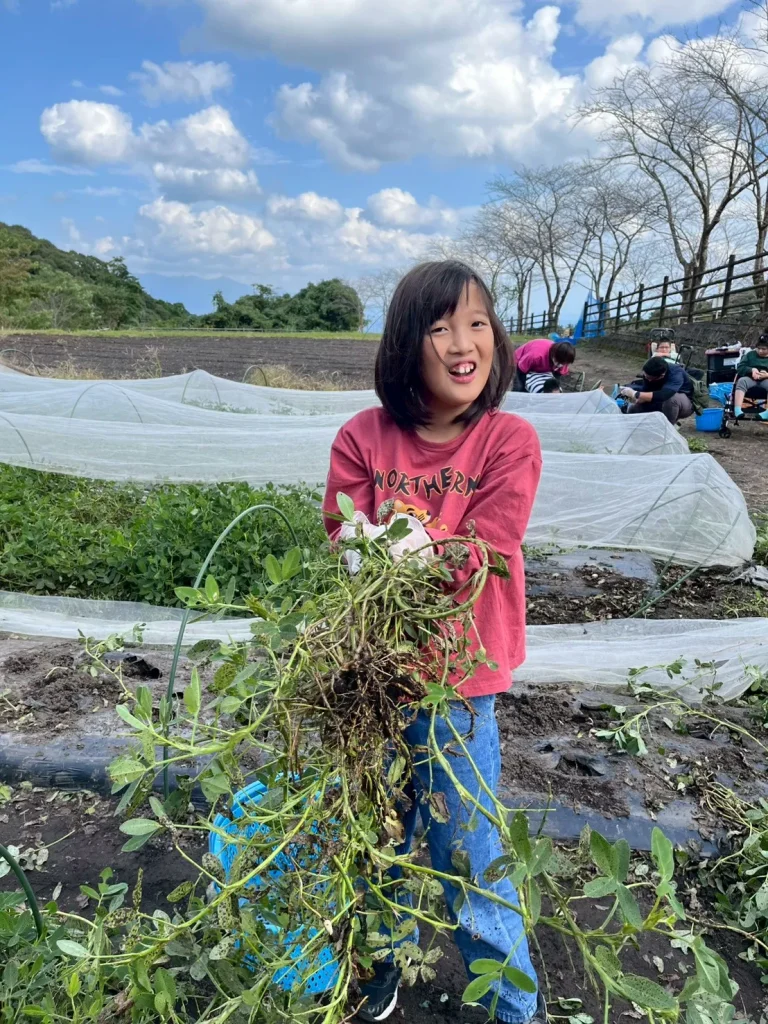 落花生の収穫体験では、土の中から出てくる実にみんな興味津々。