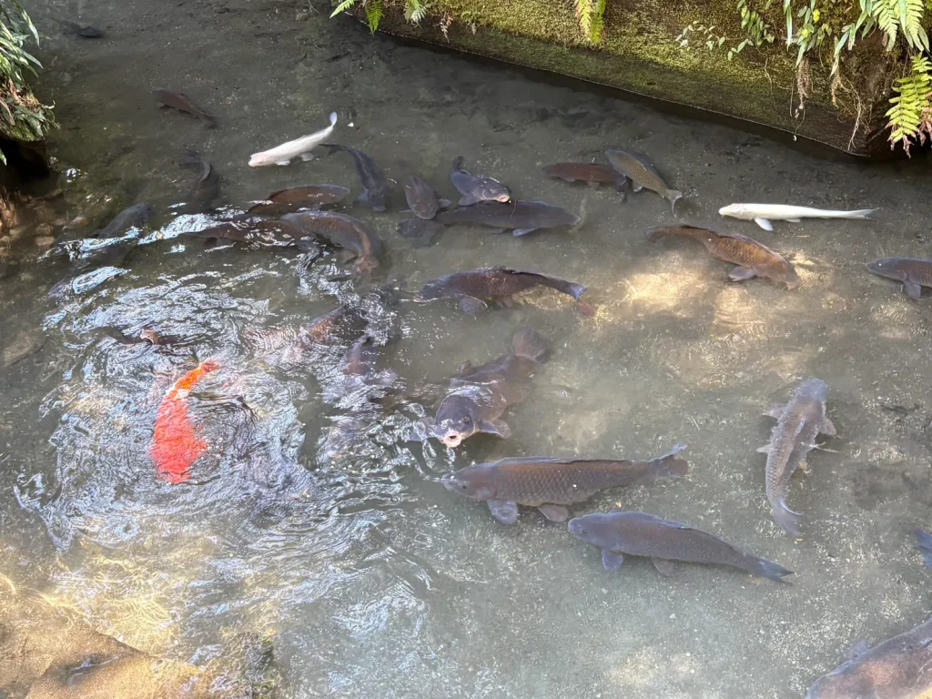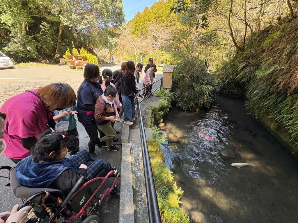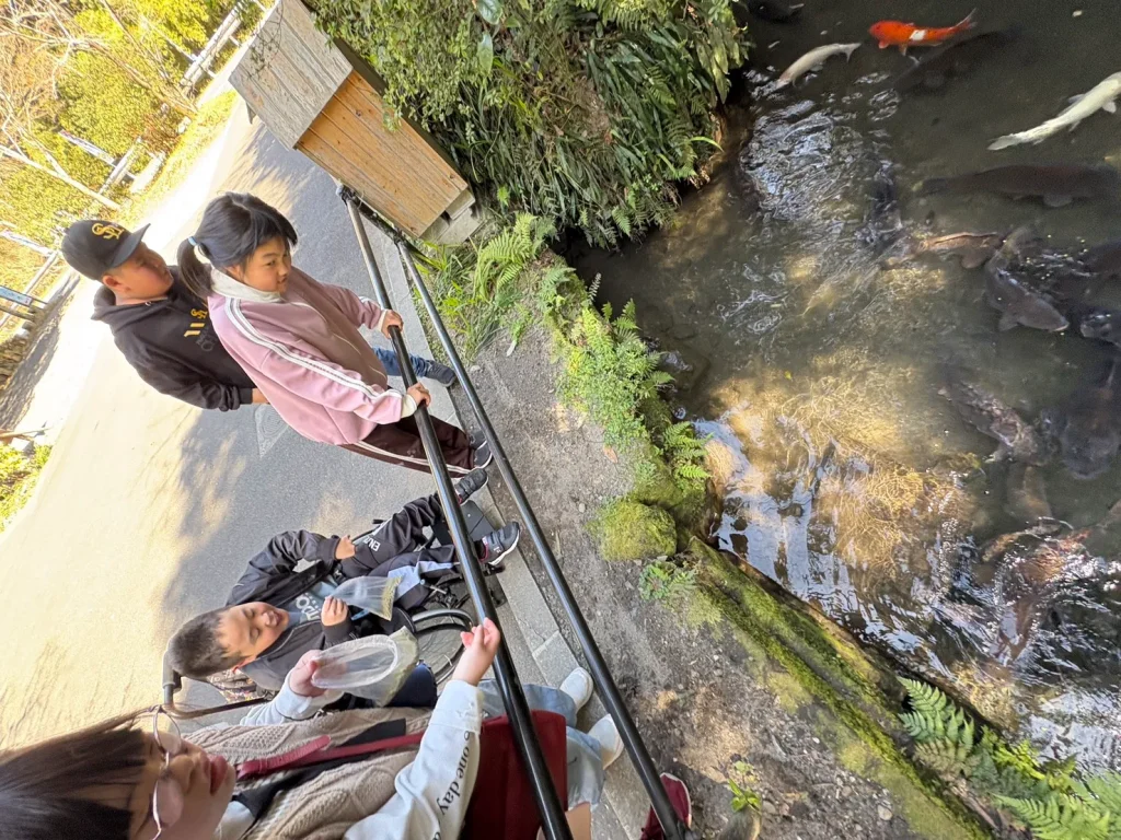 澄んだきれいな水が流れる場所で、池には大きな鯉がゆったりと泳いでおり、餌やりも体験。間近で見る鯉の大きさに驚いた様子も見られました。